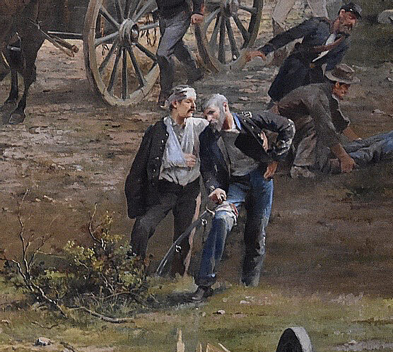 - During the Battle of Gettysburg, he was wounded in the thigh and, according to family lore, lay on the battlefield for four days before he was discovered and carried off under cover of darkness by his brother Robert. This heroic actis depicted in the e painting at the Gettysburg Cyclorama, where Robert, with his arm in a sling, is seen helping Peter, whose right leg is bandaged just above the knee (above).
